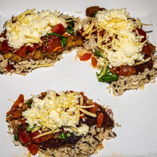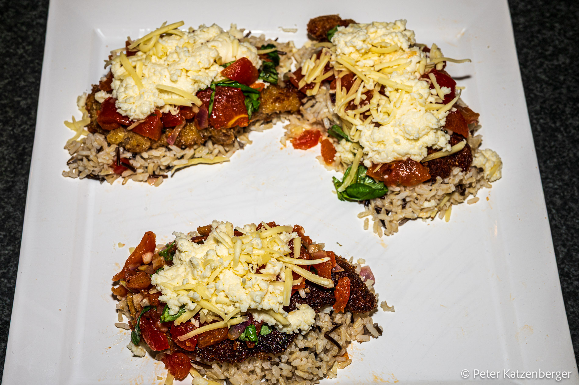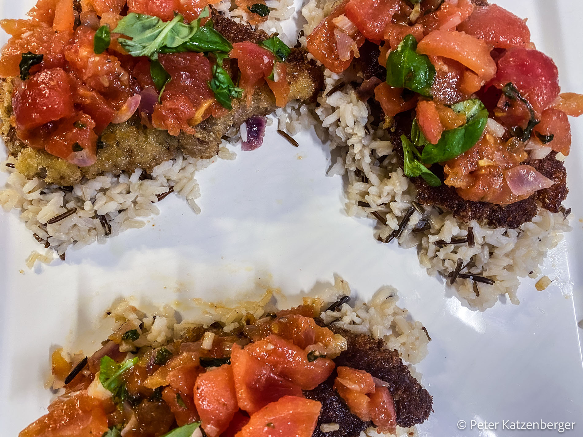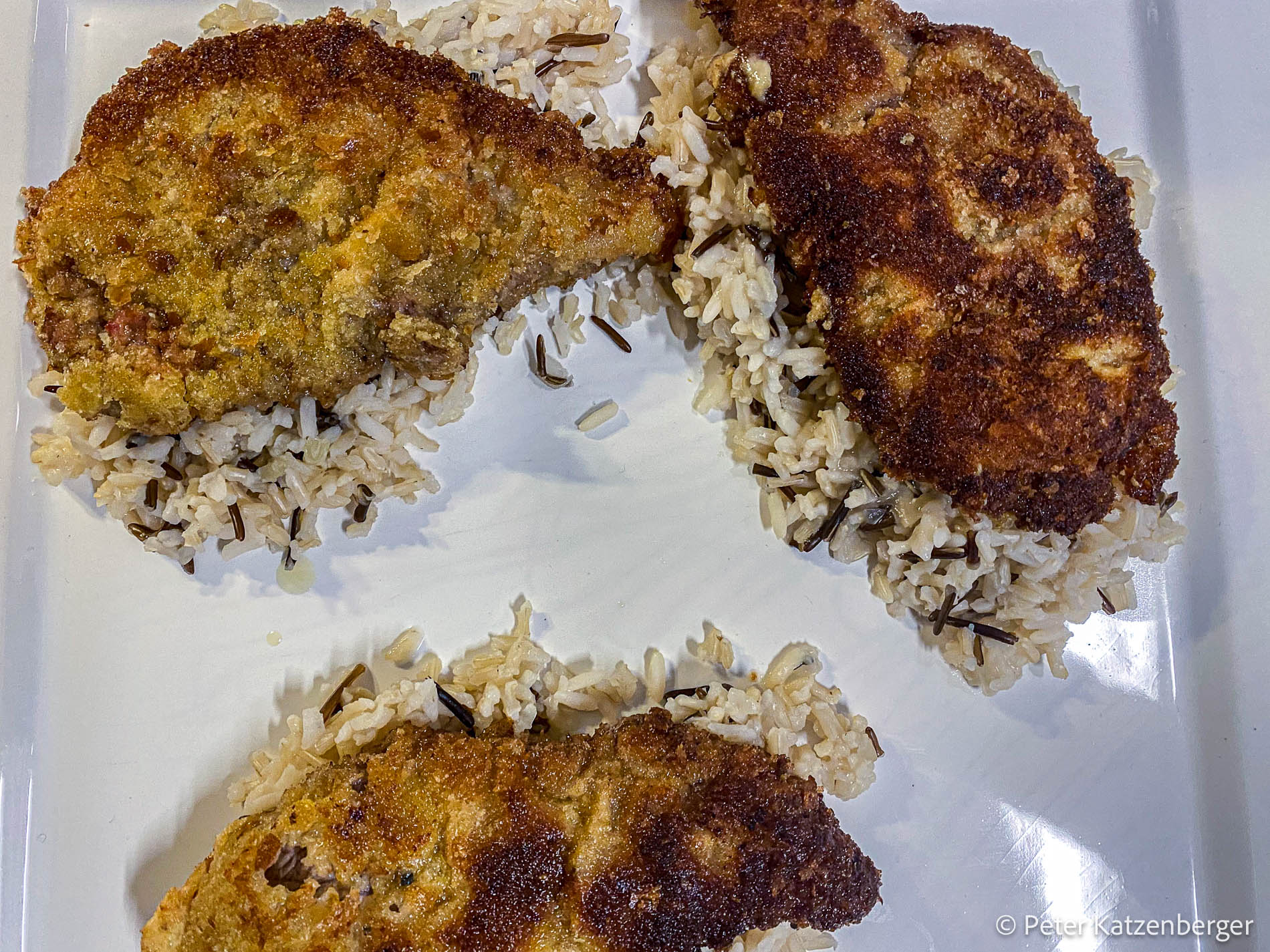 Auf der Anrichte-Platte wird der Reis in Portionen verteilt (entsprechend der Personenanzahl). Darauf kommen die panierten Schnitzel.